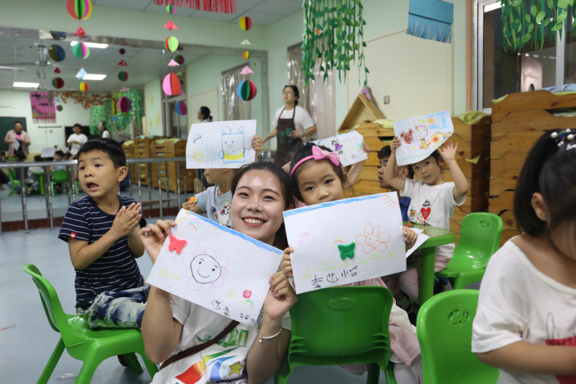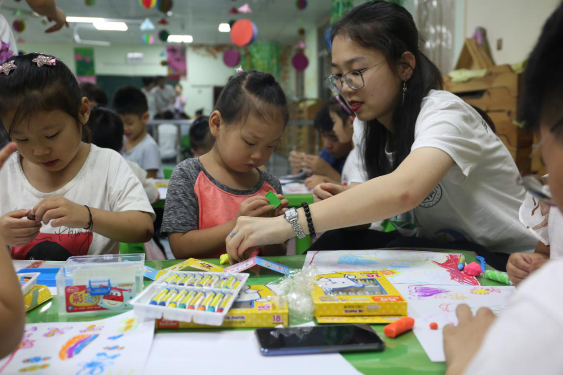 “美育浸润”实践队队员在教孩子们进行儿童画创意课程,小朋友创作完毕后将开心地展示创意手工和绘画作品。
