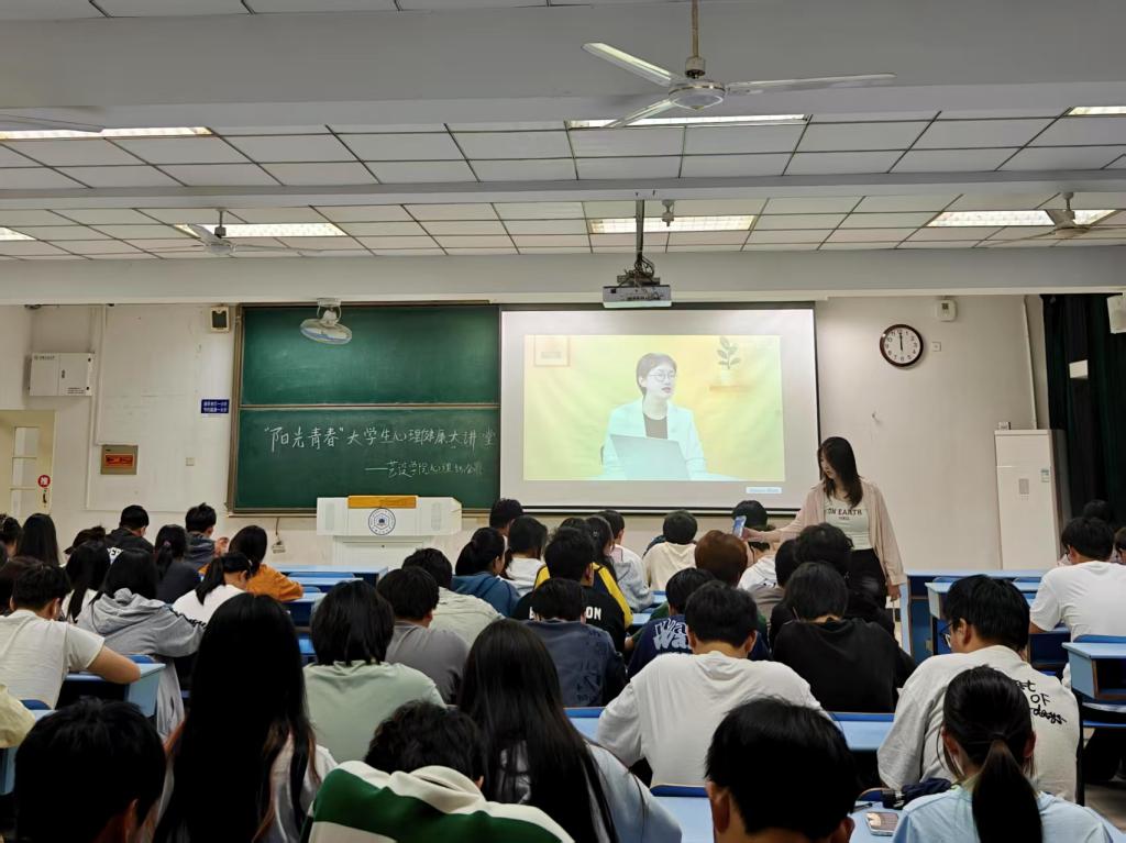于5月20日在教学楼南楼106教室组织学生集中收看2025“阳光青春”大学生心理健康大讲堂直播课程。本次活动吸引了来自不同年级的多名同学参与,大家齐聚一堂,共同学习心理健康知识,探讨AI时代下的心灵成长与自我提升。