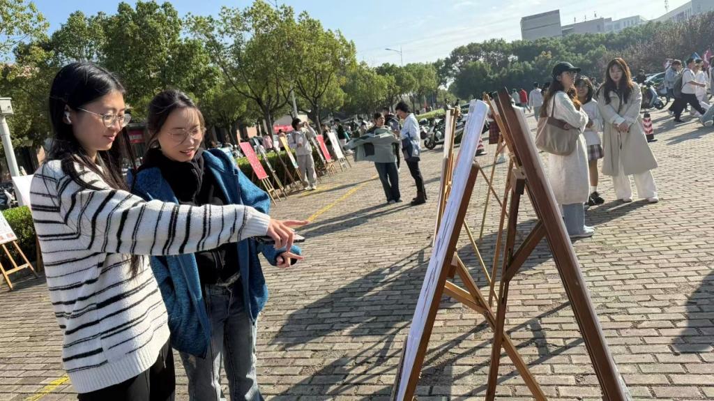 展览期间,现场吸引了众多师生驻足观看。同学们在作品前交流讨论,加深了对各类诈骗手段的识别与防范认知。学院志愿者也在现场结合画作内容,进行讲解与提示,进一步强化“不轻信、不转账、不泄露”的安全意识。此次活动通过艺术展示与实地讲解相结合的方式,营造了全员防诈的浓厚氛围,取得了良好的警示教育效果。