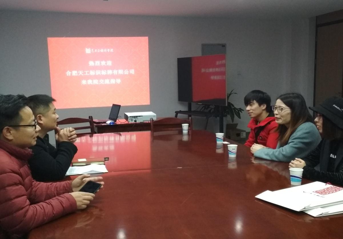 与合肥天工标识标牌有限公司设计总监岳秋月一行4人在教创北楼506就人才培养、校企合作等事宜进行了深入交流,并签订了人才培养与就业基地协议。学院党委副书记、副院长方勇、毕业班辅导员及相关负责人参加了会议。