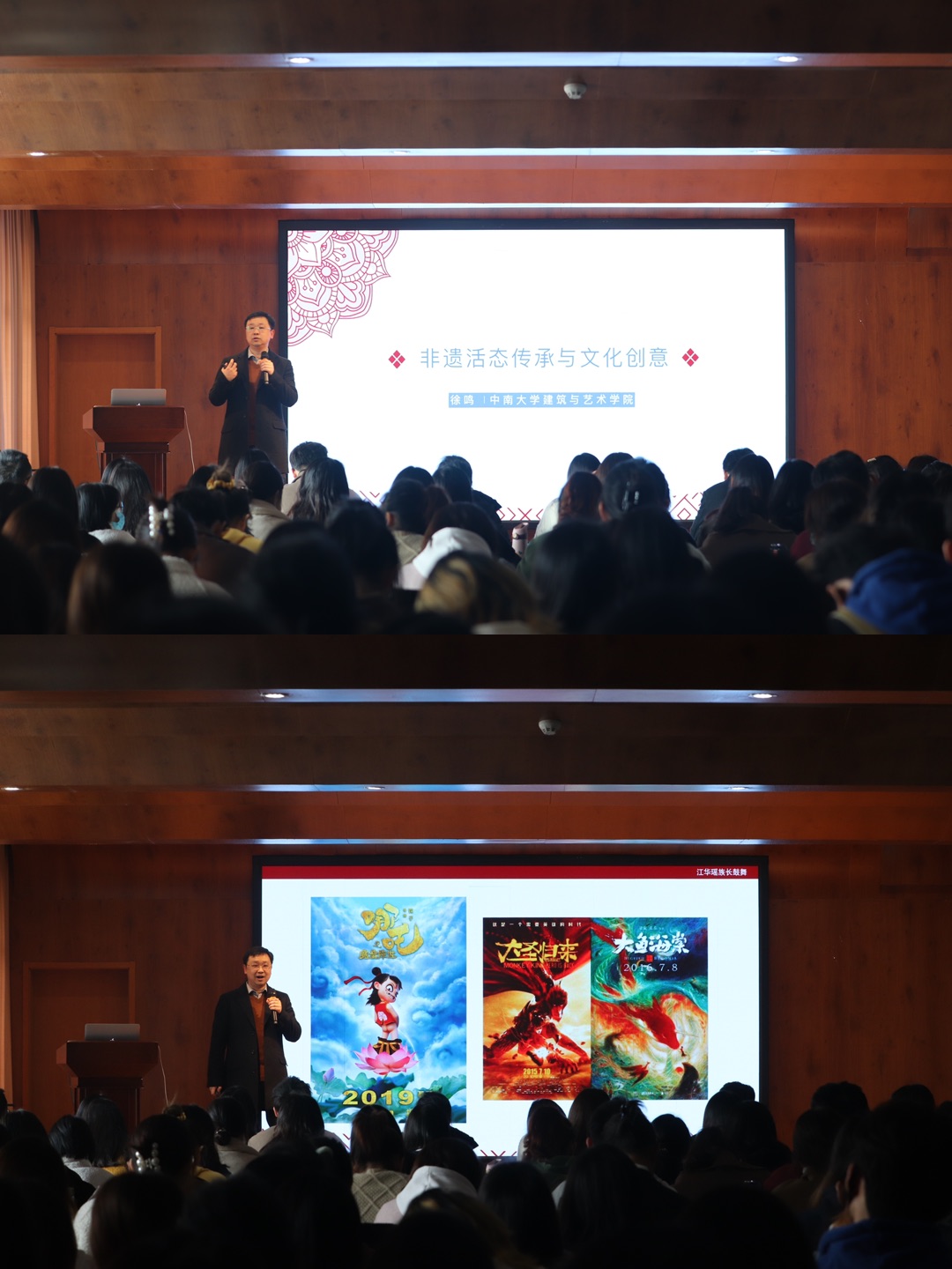 徐鸣教授在《非遗活态传承与文化创意》专题报告会中,结合自身主持的国家社科基金项目、教育部首批中华优秀传统文化艺术传承基地建设项目等,从“文化创意设计”、“瑶族长鼓非遗文创”两大方面进行了细致的讲解,徐鸣教授认为非遗传承不应是原封不动的固态保存,只有被公众所认识、欣赏、消费,重建中国式、民族式的美学意境,才是非遗文化活态传承的最佳方式。