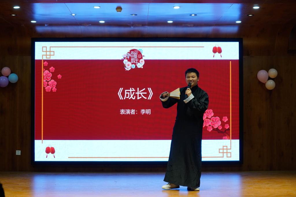 本次元旦晚会包含歌舞、话剧、脱口秀、小品等多种表演形式,节目新颖有趣、看点十足。晚会在喜庆可爱的开场舞《团团圆圆》中拉开序幕,姑娘们的青春活泼点燃了晚会的热闹氛围。歌曲《不为谁而作的歌》情感真挚动人,令人陶醉;幽默话剧《艰难抉择》无厘头式搞笑趣味十足。随后登场的小品《相亲记》、《四大才子》构思巧妙、妙趣横生,演员用生动的表情、肢体动作和滑稽的语言演绎着趣味闹剧,引得现场观众爆笑连连、掌声雷动,将晚会氛围推向高潮。暖心歌曲《old days Christmas》《pure》,舞蹈《追光》《save me save you》渲染了温馨轻松的节日气氛,使观众们深深沉醉在美妙的歌舞表演中。在脱口秀节目《成长》中,表演者将自己的真实经历汇编成有趣的包袱,语言诙谐幽默,引发同学们的共鸣。随后登台的舞蹈《solo》、《dolphin》又一次引爆全场。最后,赵颖老师倾情献唱歌曲《光》,祝福同学们在新的一年继续努力、拥抱梦想。