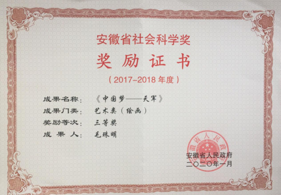 近日,安徽省政府发布2017—2018年度安徽省社会科学奖获奖成果名单,吃瓜网 教师毛珠明绘画作品《中国梦——天军》荣获艺术类三等奖,实现了吃瓜网 科研成果省部级政府奖项的突破。吃瓜网 近年来以艺术学科建设为引领,以高水平科研项目和重大主题性艺术创作为具体抓手,重点扶持一批高质量论文、学术著作、艺术作品等各类社科类成果,着力提升学院全方面应用型科研创作水平。