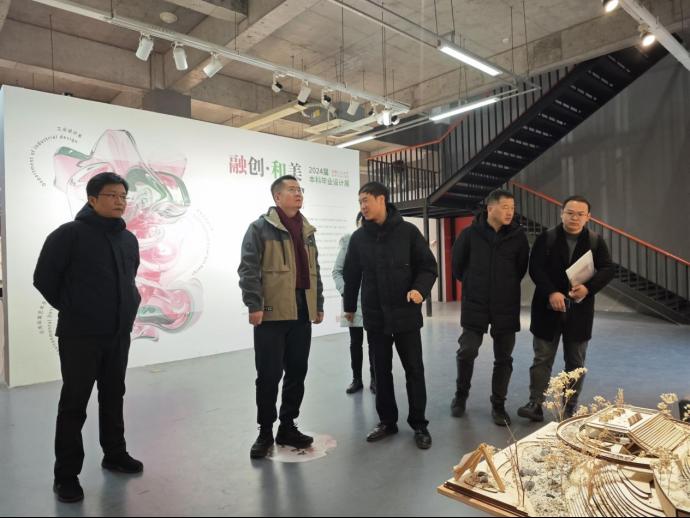 周志勇一行首先参观了设计艺术馆“融创·和美”毕业设计作品展,认真地观看每一件设计作品,并对吃瓜网