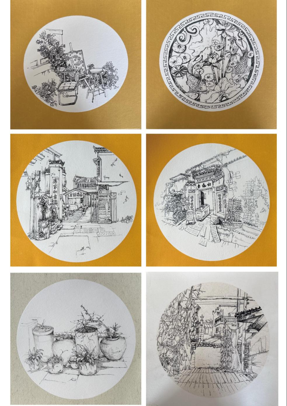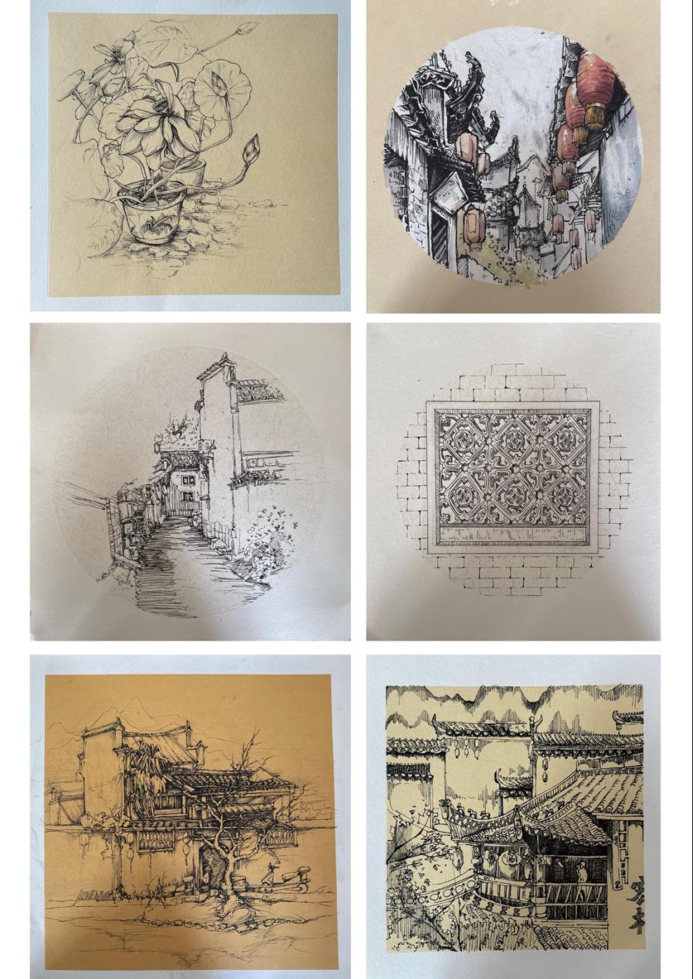 古民居是徽派建筑的代表,同学们深入承志堂、汪氏宗祠空间中,感受徽派建筑的精妙之处。老师指导学生观察古民居的布局、结构和装饰细节,学习如何用绘画手法表现古民居的韵味。同学们在绘画中注重对古民居的细节描绘,如木雕、石雕、砖雕等,通过细腻的笔触展现了徽派建筑的艺术魅力。老师还鼓励学生在绘画中加入自己的创意,将古民居与现代元素相结合,创作出具有时代感的作品。