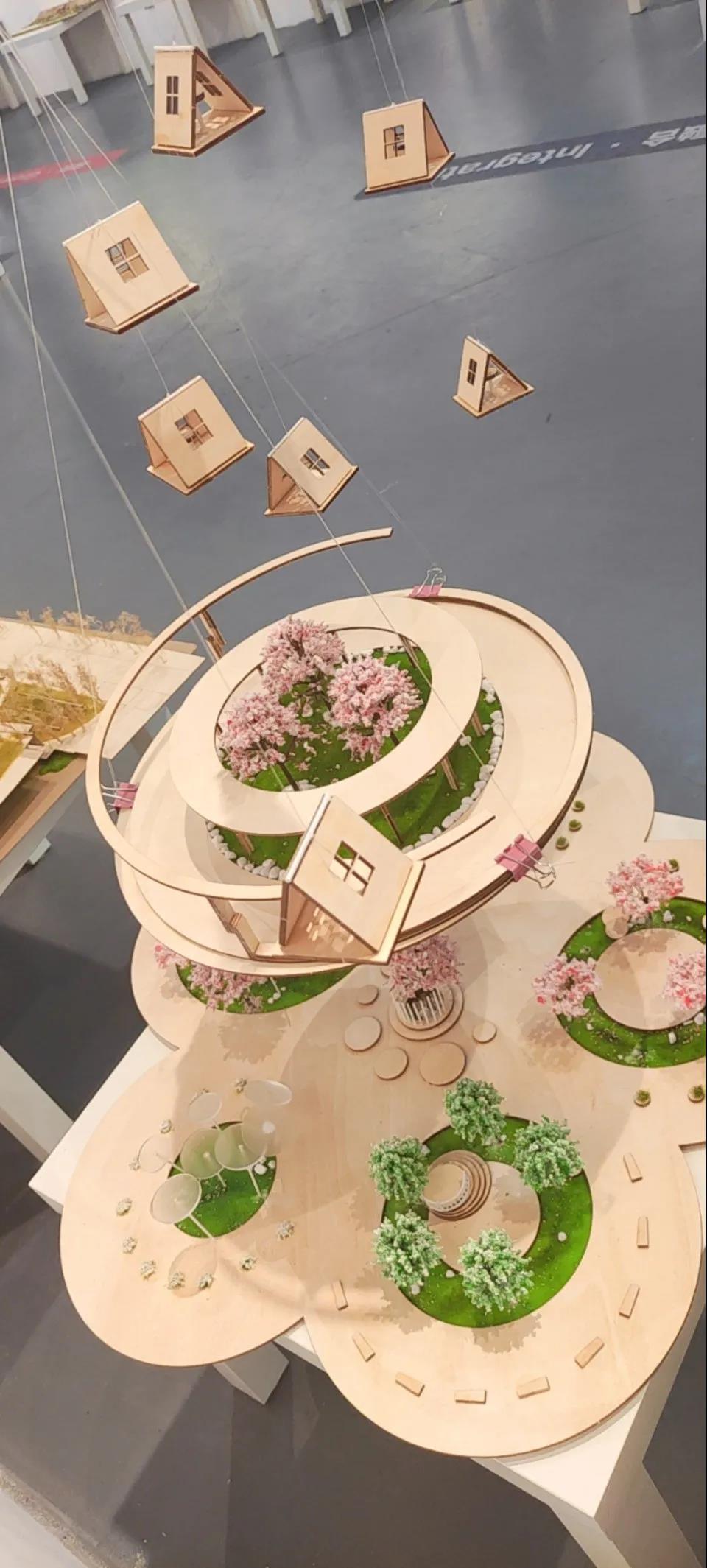 设计说明:暮去之间”主要通过对树等一系列自然元素的提取,在其原本自然形态上抽象创造,在整个空间还设置了一个机械转动的装置,将作品和空间相结合,让空间展现不断变换的形态。充斥在空间中的作品也会随时间推移,不断的产生新的形态,这一反复过程赋予了装置的另一种生命力。