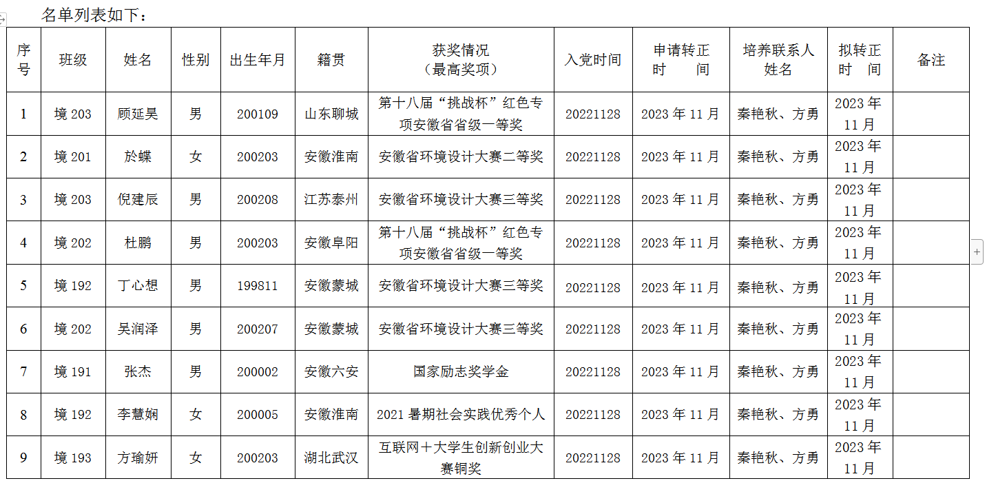 经党支部研究,拟将顾延昊等16位同志转为中共正式党员,现将他们的有关情况予以公示,欢迎广大党员、干部、群众通过信函、电话或直接到党支部或上级党组织反映公示对象在预备期间内的思想品质、现实表现、廉洁自律等方面情况。