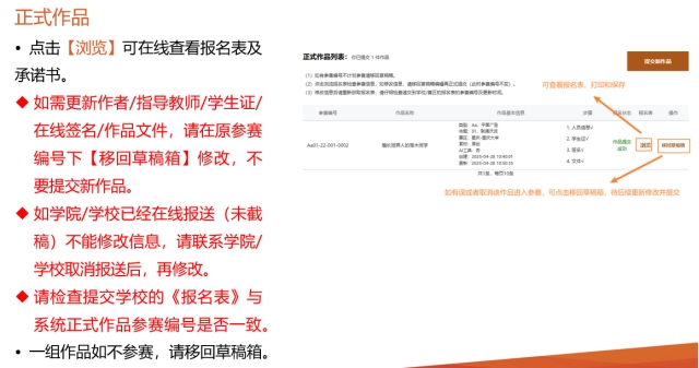 4.参赛报名表获取方法:作品提交完成,并从草稿箱移至正式作品列表,方可在报名表浏览页面下载。