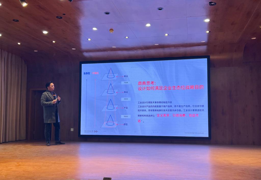 招理春副总裁首先与同学们进行了亲切互动,阐述了自己眼中的未来设计,即“定义需求、引领消费、创造市场”的模式,讲述工业设计从产品创新-商品创新-商业创新的战略,到领域纵深垂直化、解决方案专业化、需求服务本土化的三大发展路径。然后介绍了鼎典创造体集团设计赋能的实际案例,通过这些案例的讲解分析,招理春认为,我们作为一名设计师,应该有着独特的眼光去探索新方式,用细分的方式去挖掘新需求,用数据统计分析的模式去了解用户,同时认为设计驱动商业获得流量,商业流量也放大着设计价值。