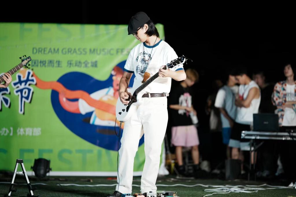 光影交错之中,天际的帷幕也被缓缓拉下,18时许,音乐节正式开始…在主持人的介绍下,来自时舞社编排的《九边型战士》登上了舞台,舞动着她们火一般的热情,以高频的节奏旋律带动大家,让现场的热情氛围不断攀升。逝光乐队带来的《let it be》、《21 guns》、《夜空中最亮的星》、《一如往常》、《山海》奏响了青春的乐章,用音乐点燃了整个星空。宽仔的原创个人说唱绽放青春的活力与魅力,引起观众的阵阵尖叫与呼喊声。随着演出的升温,也吸引来了一波波前来观赏的观众,有举着荧光棒伴随歌舞挥动的大学生,有前来一睹青春活力的老师们,也有憧憬着长大以后也能如同哥哥姐姐一样舞动歌唱的小朋友…来自个人与组合的歌唱也是声声入耳,拥有着来自个人的与众不同的魅力,灯海簇拥,人生鼎沸,感受着脉搏与音乐同频生长,燥热也未能影响全场的炸裂氛围。音乐节在逝光乐队的《drain you》中落下帷幕。