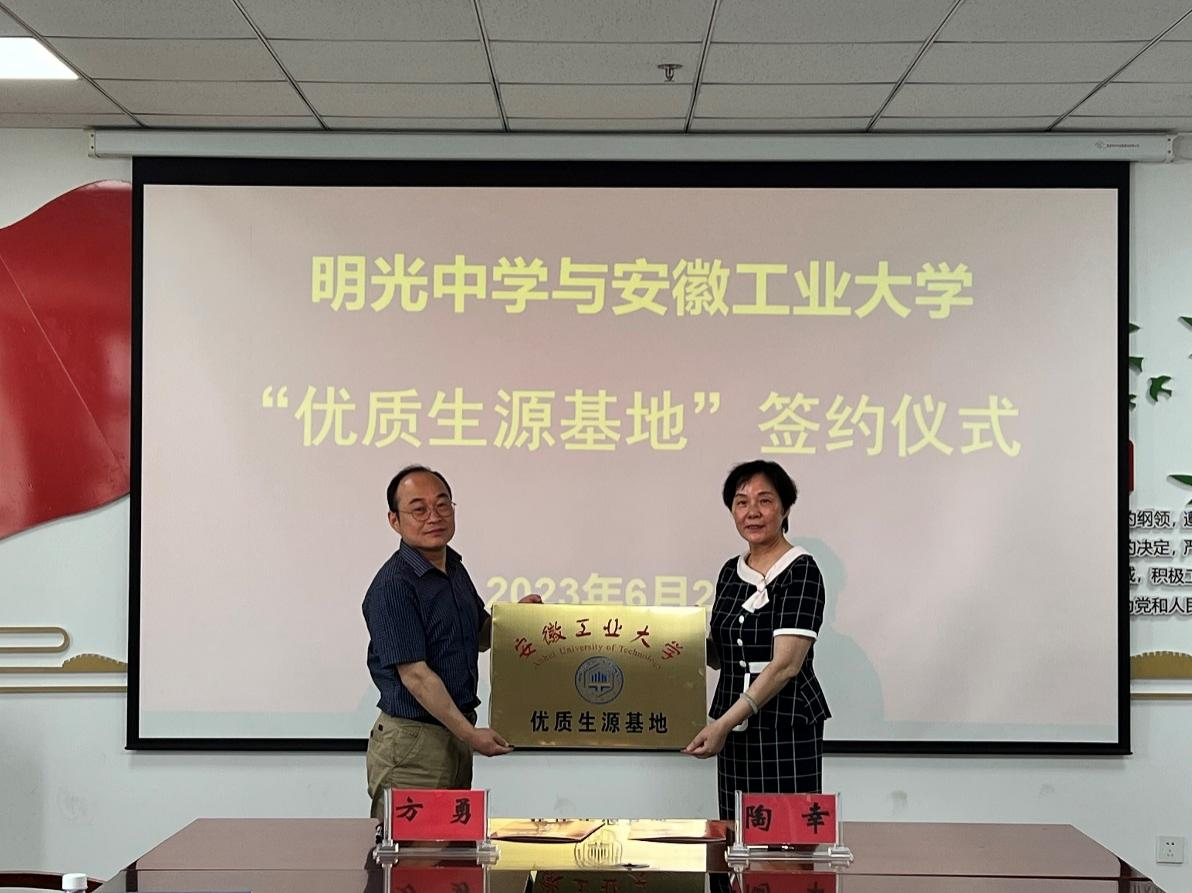 方勇与来安中学和明光中学负责人在优质生源基地建设合作协议上签字。徐宏代表学校向来安中学和明光中学授予了“优质生源基地”牌匾。(撰稿:秦艳秋 审核:罗凡 汪正 方勇)