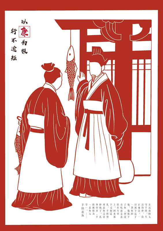 作品由艺设学院罗子越、张子影同学创作,以廉洁人物故事为主题,采用剪纸效果进行绘制,呈现“不贪为宝”、“羊续悬鱼”两个廉政故事,意指党员干部要遵从本心,不被利益所诱惑。