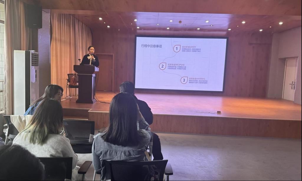 最后,辅导员秦秋艳再一次强调了外出安全方面的问题,对外出行程中所需的必备品进行了详细的说明,并提醒同学课程请假事项。