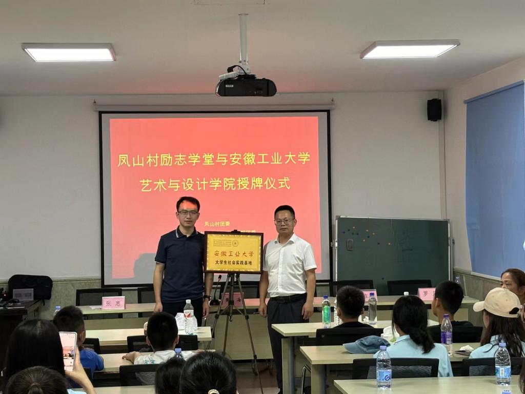 7月4日,艺术与设计学院与马鞍山市濮塘镇凤山村大学生社会实践基地授牌仪式在凤山村励志学堂顺利举行。凤山村党总支书记黄海、马鞍山市壹加壹助学协会执行会长严经纬、艺术与设计学院团委书记汪正、商学院团委副书记刘在春以及凤山村党群代表、参与暑期社会实践队伍的师生代表出席了本次仪式。