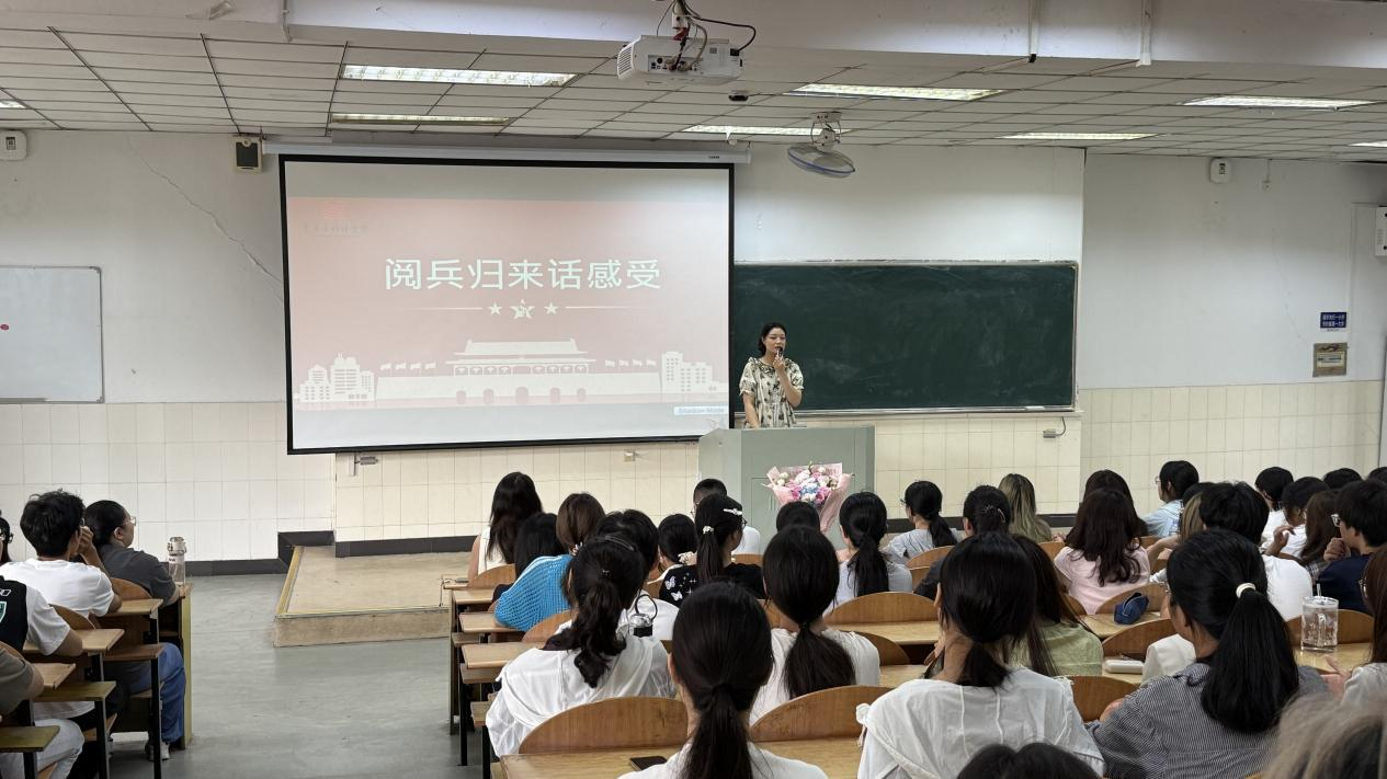 学院还邀请到2023级研究生汤涵来分享参与“九三盛大阅兵”感受,她从体检、选拔、训练等多个环节分享,“200多个训练的日日夜夜,每个人晒脱了几层皮,踢坏了好几双靴子,但所有人都咬牙坚持,因为祖国荣誉高于一切。”汤涵表示,参阅经历不仅是一次终身难忘的荣光,更是一次深刻的精神洗礼和爱国主义教育。在场新生也表示,会以汤涵为榜样,认真参加军训,磨练钢铁意志。