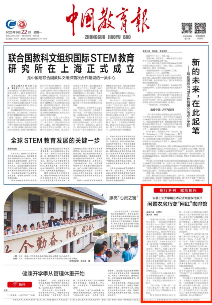 近日,我院服务乡村振兴的显著成果获得国家级主流媒体高度关注。9月22日,教育部主管的权威媒体《中国教育报》在头版显著位置刊登文章《安徽工业大学用艺术设计赋能乡村振兴 闲置农房巧变“网红”咖啡馆》,深度报道了学院师生团队利用专业特长,将艺术设计融入乡村建设,成功激活乡村闲置资源的创新实践。
