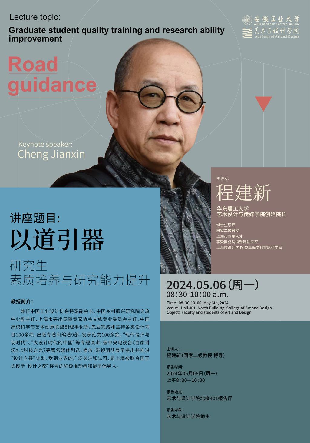 程建新:华东理工大学艺术设计与传媒学院创始院长,博士生导师,国家二级教授,上海市领军人才、享受国务院特殊津贴专家、上海市设计学 IV 类高峰学科首席科学家;兼任中国工业设计协会特邀副会长、中国乡村振兴研究院文旅中心副主任、上海市突出贡献专家协会文旅专业委员会主任、中国高校科学与艺术创意联盟副理事长等。先后完成和主持各类设计项目100余项,出版专著和编著9部,发表论文100余篇;“现代设计与现时代”、“大设计时代的中国”等专题演讲,被中央电视台《百家讲坛》、《科技之光》等著名媒体列选、播放;带领团队最早提出并推进“设计立县”计划,受到业界的广泛关注和认可,是上海被联合国正式授予“设计之都”称号的积极推动者和最早倡导人。